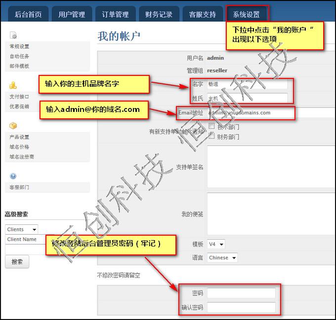 2、登陆后台——系统设置——我的账户,按照图片中的方法,设置好信息