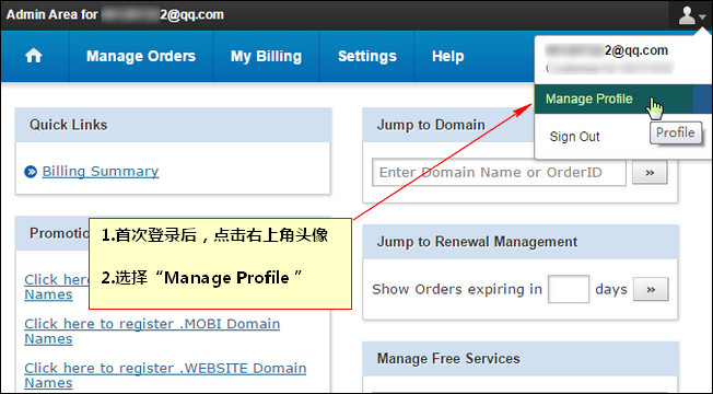 4.进入后台后,点击右上角的“倒三角”,选择第一个选项“Manage Profile”