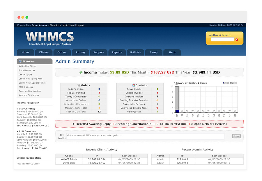 WHMCS为主机商/域名商/软件服务商提供完善的产品、客户、财务及客户支持管理功能。可轻松接入Paypal、Alipay(支付宝)、微信支付等支付网关。